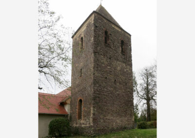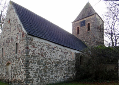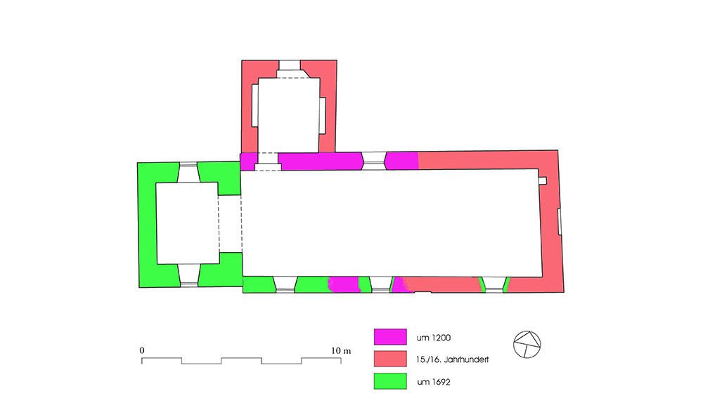 Der ursprüngliche Bau der Saalkirche kann in der Zeit um 1200 oder auch bereits etwas eher entstanden sein. Möglicherweise hatte dieser erste Saalbau eine Länge von nur zehn bis zwölf Metern und schloss mit eingezogenem Chor und Apsis im Osten sowie einem Turm im Westen. Aus dieser Zeit hat sich ein heute vermauertes Fenster im Bereich der ehemaligen Saalnordwand erhalten (Abb. 04).