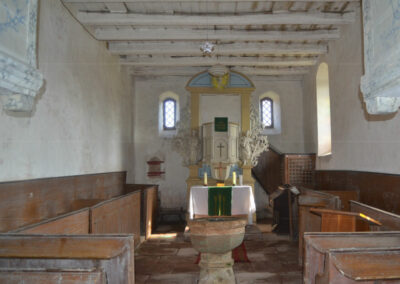 Die Kirche wird über einen Zugang durch den nördlichen Vorraum erschlossen. Den Innenraum prägt zum einen der spätbarocke Kanzelaltar, zum anderen die kurze Hufeisenempore sowie das einfache barocke Kastengestühl (Abb. 03). Der Fußboden besteht aus Sandsteinplatten. Die Decke setzt sich überwiegend aus Eichenholzbalken zusammen. Sechs Fenster belichten den Saal: An der Südfassade drei größere Fenster mit Korbbogenschluss, an der Ostseite (Chorschluss) zwei kleinere Fenster mit flachem Bogensturz und ein Fenster neben der Empore. Das östliche Mauerwerk des Turmes hat eine Rundbogenöffnung zum Saal hin.