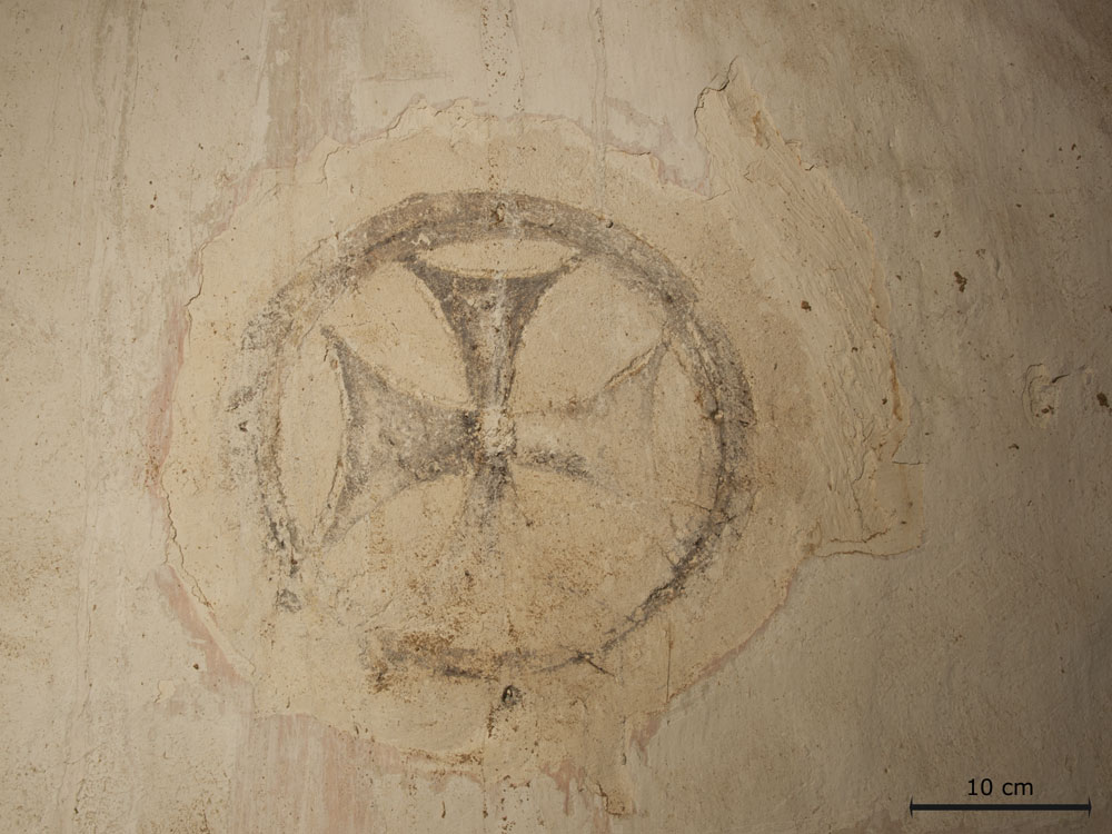 Südwand, Mitte, Detail des oberen linken Randes des Weihekreuzes, Streiflicht. Gut erkennbar sind die noch in frischem Putz erfolgten Ritzungen zur Anlage der Konturen