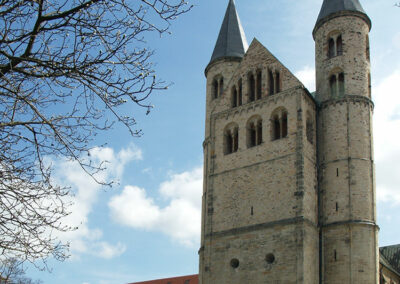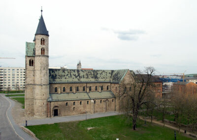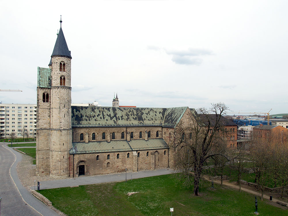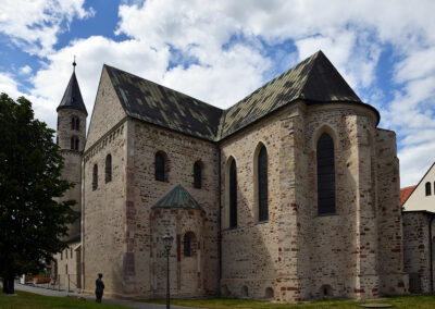 Bei dem Kirchenbau handelt es sich um eine dreischiffige Basilika mit Querhaus, Krypta und erhöhtem Chor. Die Krypta ist Ausgangspunkt der frühen Bauaktivität Bischof Werners, der Bauablauf wurde im 11. Jahrhundert von Osten nach Westen betrieben (Abb. 01).
