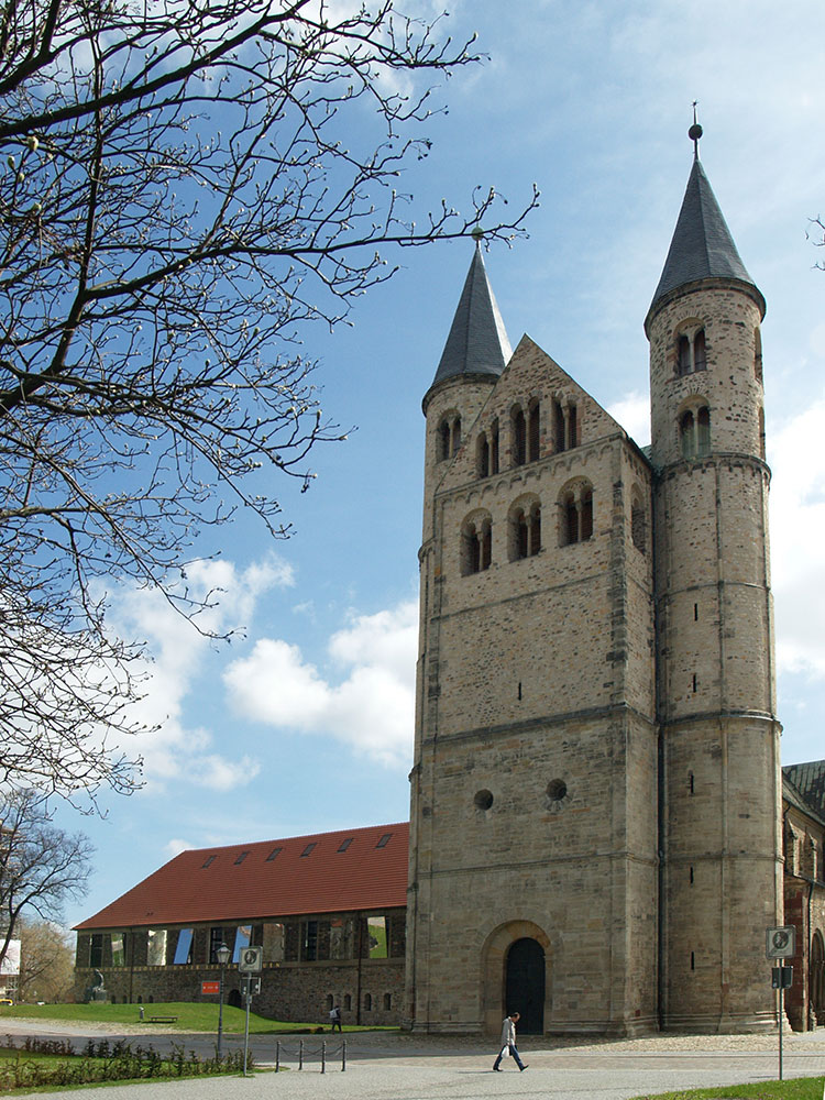 Im 3. Viertel des 11. Jahrhunderts entstanden Stiftsklausur und Kirche mit flachgedeckter, kreuzförmiger Basilika und Hallenkrypta. Die Zweiturmfassade, die im Westen den Bau abschließt, wurde später begonnen, wohl erst im dritten Jahrzehnt des 12. Jahrhunderts.