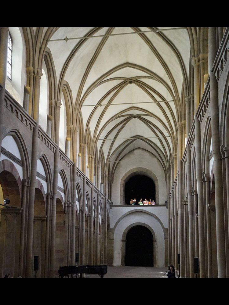 Unter dem erhöhten Chor mit Apsis befindet sich die dreischiffige Hallenkrypta, deren Kreuzgratgewölbe auf schlanken Säulen und Halbsäulen lagert. (Abb. 03)