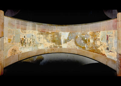 Der Zustand der Malereien ist eine Folge der seit mehreren Jahrzehnten in ungünstiger Weise bestehenden starken bauphysikalischen, klimatischen und weiteren schadbildbegünstigenden Rahmenbedingung (Abb. 07). Bereits im späten 19. Jahrhundert sowie in den 1970er/1980er Jahren wurde dem zunehmenden Verfall mit dem Eintrag spannungsreicher und bedingt alterungsbeständiger Festigungsmittel begegnet. Gleichzeitig wurde den Schadensursachen nur gering bis gar nicht Rechnung getragen. Die Folge: Belastungen durch bauschädliche Salze, Totalverluste, Entfestigungen der Substanz sowie massiv beeinträchtigende Vergilbungen und Vergrauungen. Darüber hinaus zeigt die Malereioberfläche verschiedene Übermalungen und zeichnerische Nachkonturierungen.¹⁰ Aktuell (Stand 2021) wird die Malerei restauriert.