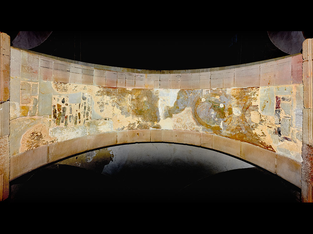 Gesamtansicht der Bogenlaibung mit mittelalterlicher Wandmalerei (bearbeitet mit Tonwertkorrektur) im Zustand Februar 2020