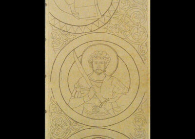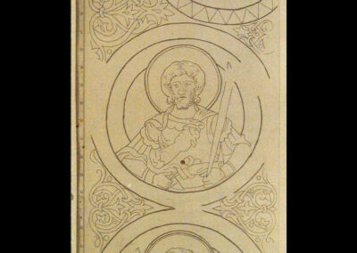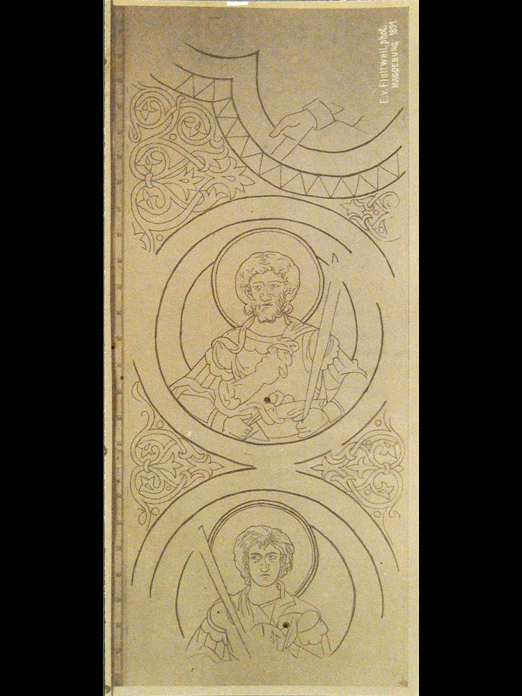In der Laibung des Gurtbogens finden sich fünf Halbfiguren in Medaillons aufgereiht, die in den Zwickeln von stilisiertem Rankenwerk eingefasst werden (Abb. 07).⁴ Historische Fotografien von Eduard von Flottwell aus den Jahr 1891 sowie Umzeichnungen und ältere Beschreibungen helfen heute bei der näheren Identifizierung des Dargestellten (Abb. 08).⁵