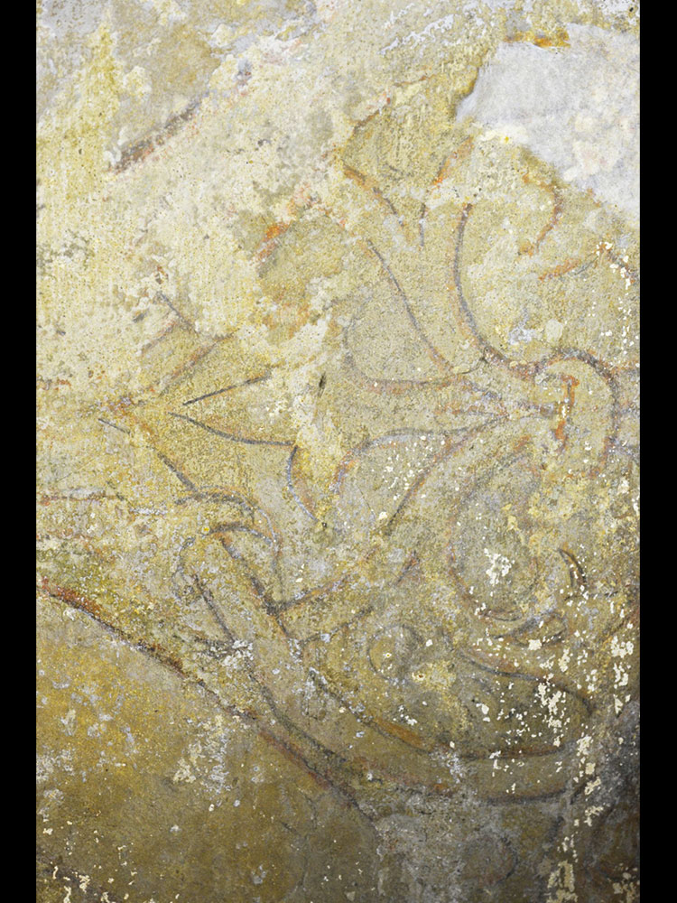 Detail des ornamentalen Rankenwerks im Umfeld der Christusdarstellung, Bestand der Malerei und jüngere Nachzeichnungen mit Graphitstift o.ä.