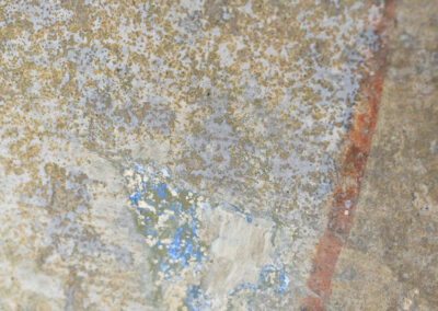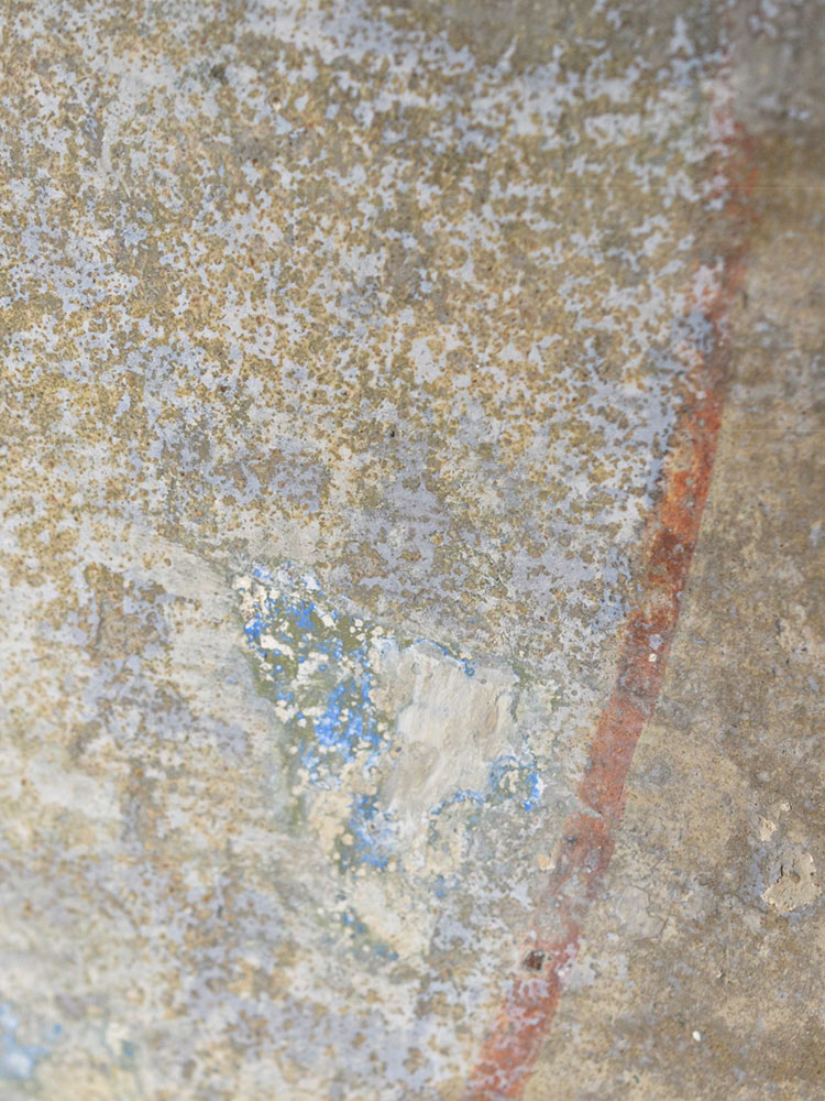 Die Wandmalereien präsentieren sich zum Zeitpunkt der im Folgenden dargestellten Eigenschaften in einem weitreichend desolaten, erheblich reduzierten und ästhetisch stark beeinträchtigten Zustand. Im Zuge von Konservierungsmaßnahmen durch Dipl.-Rest. Thomas Groll 1996 sowie 2018 in Zusammenarbeit mit Dipl.-Rest. Marie Heyer wurde zumindest eine visuelle Erfassung und Beschreibung des Bestandes durchgeführt. Demnach liegt die Malerei auf einem stark geglätteten, kalkgebundenen Verputz. Die erste Anlage der Konturen erfolgte in Form roter Vorzeichnungen. Die Malerei ist mehrschichtig und teils pastos aufgetragen (Abb. 09, 10). Die Binnenflächen wurden in den Hauptfarben Blau, Grün und Rot gestaltet. Als Pigment für die Erstellung der grünen und blauen Farbmittel sind Kupferpigmente anzunehmen (Abb. 11). Inwieweit die rote Vorzeichnung bildgebendes Mittel z.B. als Kontur war bleibt bis dato offen. Eine abschließende Bewertung zu den verwendeten Bindemitteln ist durch den starken Überarbeitungsgrad nicht möglich. Die Bearbeiter der Konservierungskampagnen vermuten am ehesten eine Ausführung in Secco-Technik, eventuell unter Verwendung eines proteinhaltigen Bindemittels.