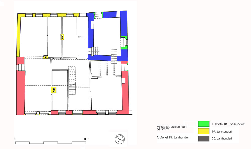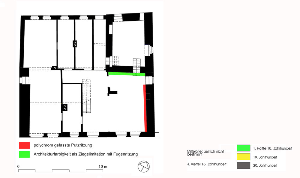 Die nachstehend beschriebenen Gestaltungselemente haben sich an der Nord- und Westwand des großen straßenseitigen Erdgeschossraums erhalten, der ehemals wohl mit Wandöffnungen (Wandschrank, Wandnische, Kamin) repräsentativ ausgestattet war (Abb. 04).