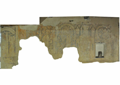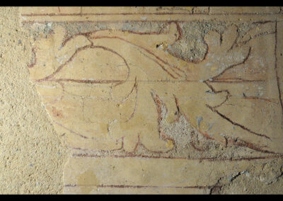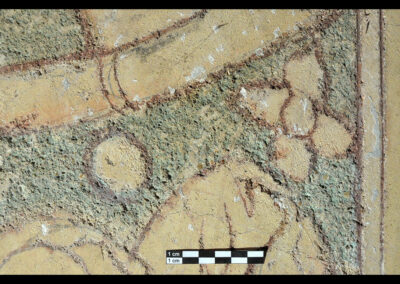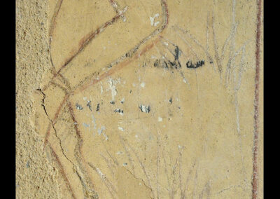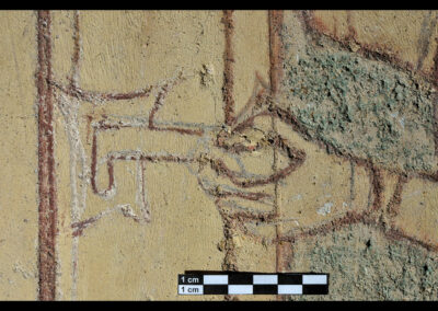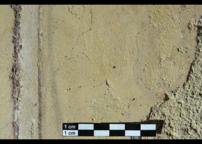 Als Verputz diente ein vermutlich latent hydraulischer Kalkputz mit hoher innerer Festigkeit bei gleichzeitiger geringer Bindung. Er wurde im Bereich der Nordwand in drei horizontalen Putzportionen aufgetragen und eingeglättet (Abb. 17). Für die erste Anlage der Komposition wurde eine Vorzeichnung mit einem Kohlestift erstellt (Abb. 18, 19). Diese hinterließ teils feine Rillen. Anschließend erfolgte die Anlage der Konturen durch stärkeres Einritzen in den Putz. Die Hintergründe wurden großflächig aufgeraut (Abb. 20, 21). In beiden Fällen kommt es zu deutlichen Abweichungen von den Vorgaben der Vorzeichnung (Abb. 22, 23).