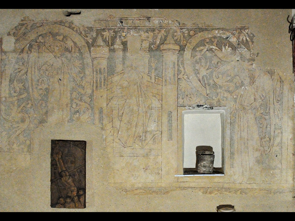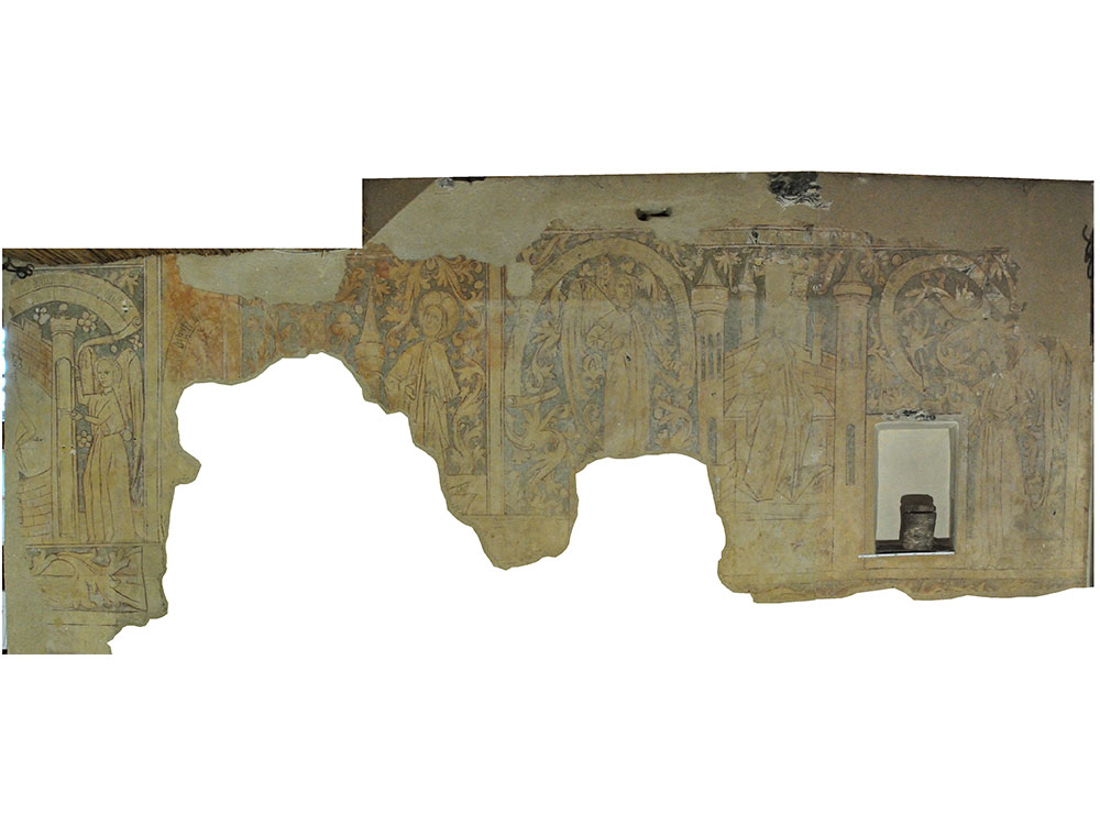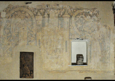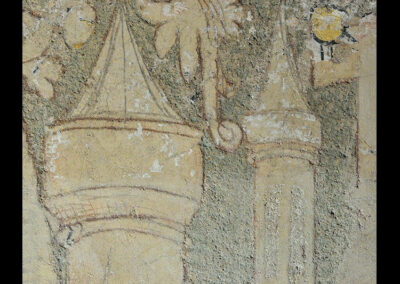 Polychrom gefasste, figürliche Putzritzungen mit drei szenischen Darstellungen in umlaufenden Rahmenlinien, deren Bestand durch Veränderungen der Sockelzone teilweise reduziert ist (Abb. 05).⁶