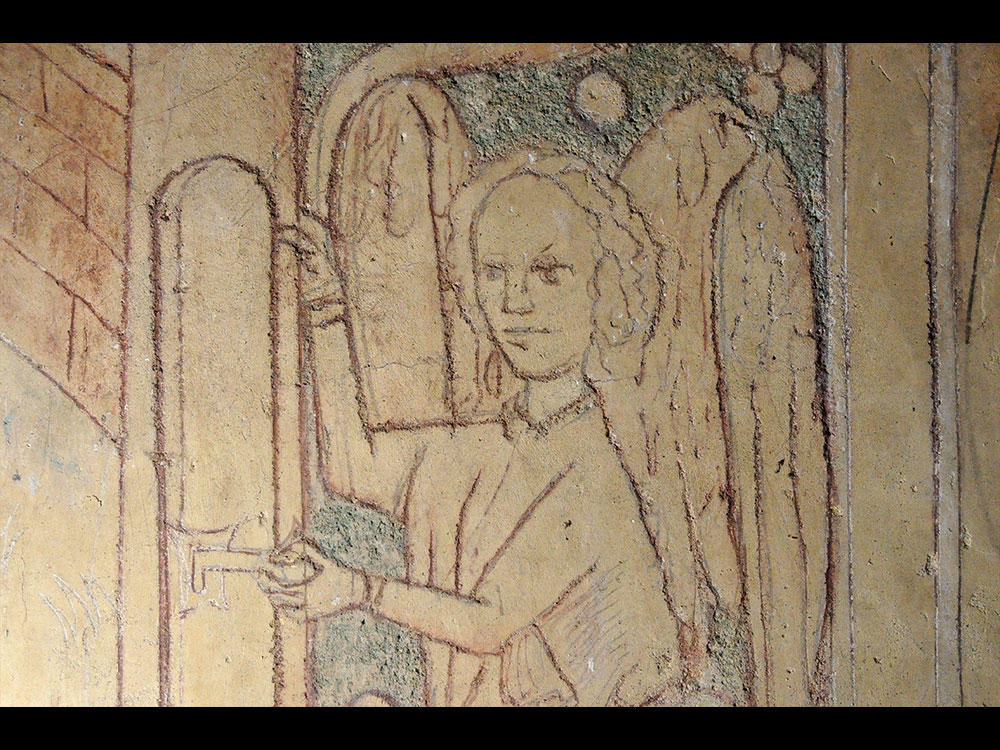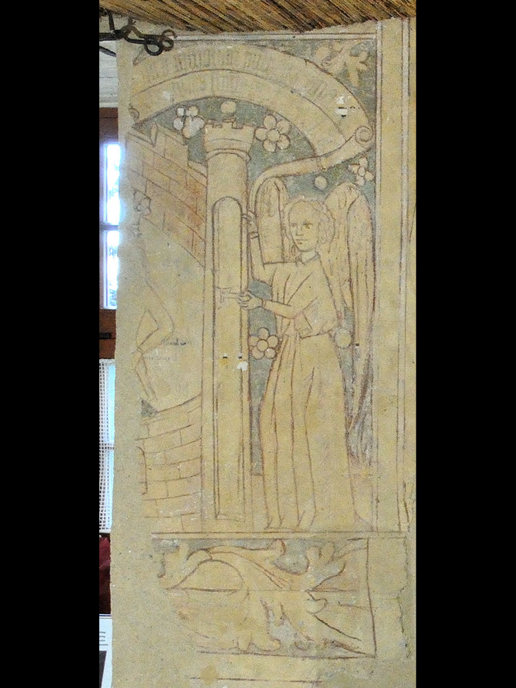 Von der westlichsten Darstellung hat sich nur die rechte Bildhälfte erhalten. Sie zeigt einen stehenden Engel mit einem Schlüssel, der die Pforte eines Mauerturms öffnet und mit seiner rechten Hand das Ende eines geschwungenen Schriftbandes hält. Fünfblättrige Blüten um ihn deuten eine Gartenlandschaft an. Doch befindet sich der eigentliche hortus conclusus innerhalb des Mauerrings. Dieser umschlossene Garten dient als Symbol für die Reinheit der Jungfrau Maria (Hoheslied 4,12).⁹ Links inmitten des Mauerrings ist in der verlorenen Bildmitte die bekrönte Maria, die jungfräuliche Mutter Christi, zu vermuten, von der sich nur der linke Arm und ein Teil der Krone erhalten haben. Nur unter dem westlichen Bildfeld blieb der untere Abschluss aus einem breiten Ornamentband mit einer Akanthusranke bestehen.¹⁰