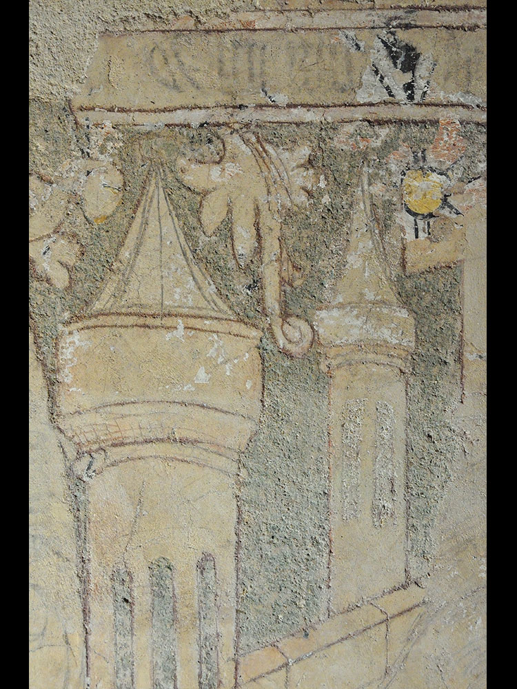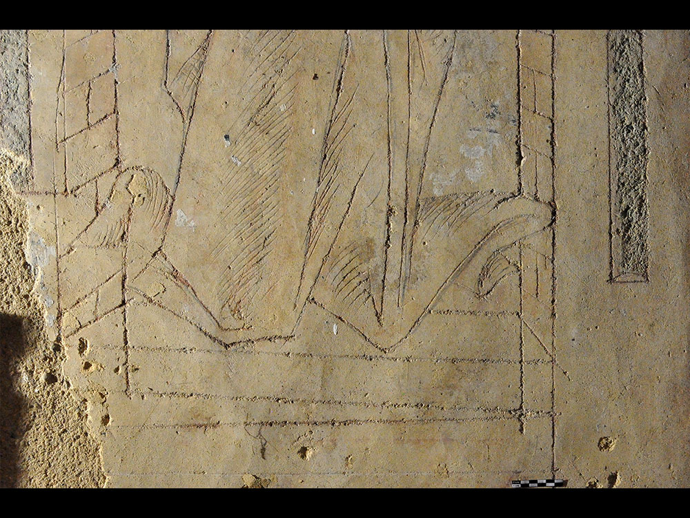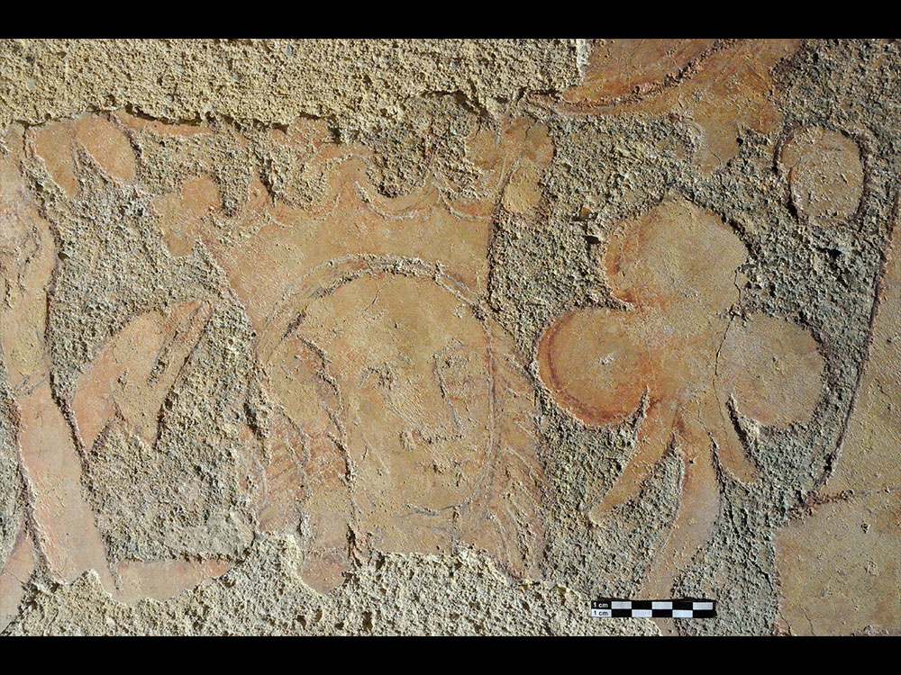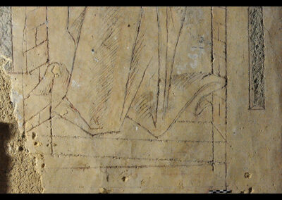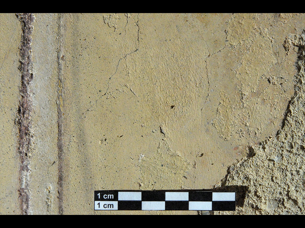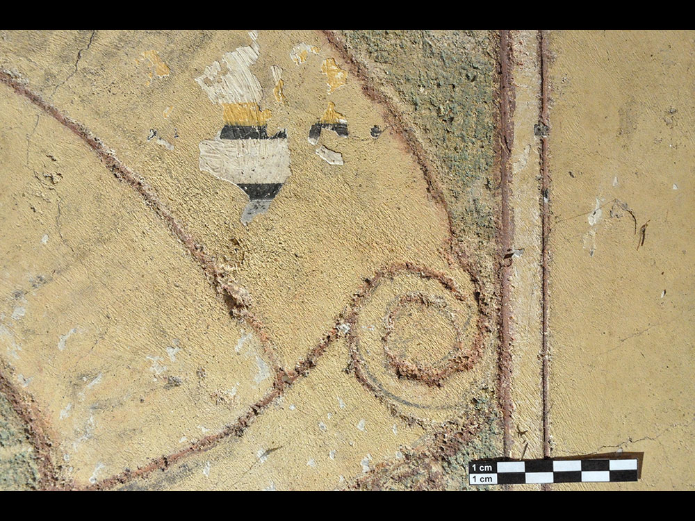 Detail des Schlüssels in Abb. 07 mit grauschwarzen Vorzeichnungen, die teils flache Rillen und teils Ritzungen erzeugt haben sowie eine senkrechte Angabe der Außenkante der Architektur, die durch die Hand verläuft und frisch in den Putz eingearbeitet wurde (weiche Kanten). Die spätere Kontur deckt sich häufig nicht mit der Vorzeichnung