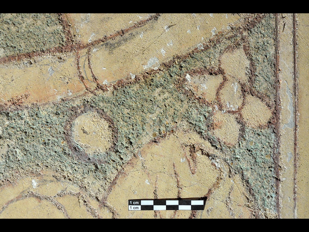 Die Fassung der Oberflächen erfolgte in einer Mischtechnik. Zu den freskal eingebundenen Abschnitten zählt z.B. das schwarze Schriftband (Abb. 16, 21). Bei der farbigen Ausgestaltung der übrigen Dekoration kam, nach Analysen im Jahr 2000 entsprechend, wohl Kalk mit Zusatz eines proteinischen Bindemittels zum Einsatz. Hierbei wurden die optisch vorn liegenden Bereiche mit rotem Ocker in unterschiedlichen Schattierungen und die Hintergründe mit Azurit in hellem Blau (heute zu Grün umgewandelt) gestaltet (Abb. 20). Auf den Rahmungen der Bildfelder fanden sich außerdem orangerote Begleitstriche aus Mennige auf einer weißen Grundierung. Als letzter Arbeitsschritt wurden die Konturen und Teile der Binnenzeichnungen mit einem hämatithaltigen Dunkelrot nachgezogen (Abb. 19-21).¹⁷
