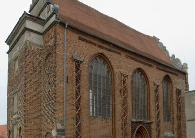 Die Schlosskapelle ist in ihrem Grundriss ein rechteckiger Bau, der unter Einbeziehung der inneren Ringmauer der Oberburg im letzten Drittel des 15. Jahrhunderts entstanden ist (Abb. 01). Sie hat eine Größe von 22,5 m x 10 m, ist in drei Joche untergliedert und wurde fast vollständig aus Backstein errichtet (Abb. 02).