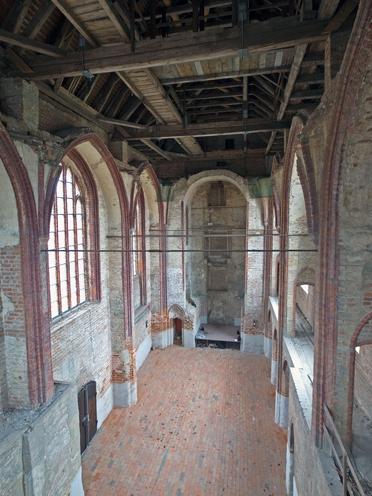 Der helle einschiffige Saal wird in seiner Erscheinung durch die großen Fenster und zahlreiche Nischen geprägt. Oberhalb dieser Wandnischen gibt es Laufgänge, die entlang der Umfassungswände innen vorgelegt worden sind und durch Treppen erreicht werden können (Abb. 03). Die Strebepfeiler befinden sich an der Innenseite der Längswände. Sie sind im Erdgeschoss durch gewölbte Nischen miteinander verbunden. Von den Pfeilern aus überspannten einst Kreuzrippengewölbe die Kapelle, deren Gewölbeanfänger in Resten noch vorhanden sind. Die Gewölbe sind wohl Ende des 18. Jahrhunderts aufgrund statischer Schwierigkeiten zurückgebaut worden.