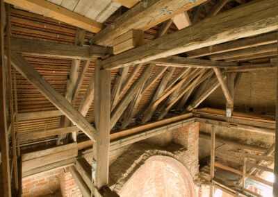 Die als Kehlbalkendach konzipierte Dachkonstruktion mit doppelt stehendem Stuhl und Kreuzverstrebung gehört zum Ursprungsbau, wurde aber mehrfach repariert (Abb. 04).