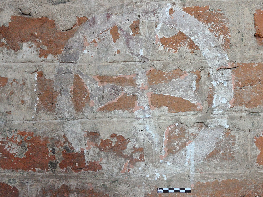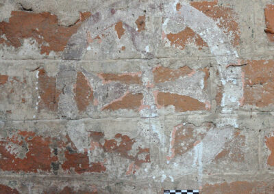 Ritzungen in der Kalktünche zur Vorbereitung der Weihekreuze unter Zuhilfenahme eines Zirkels, dessen Einstichpunkt noch in der Kreuzmitte ablesbar ist