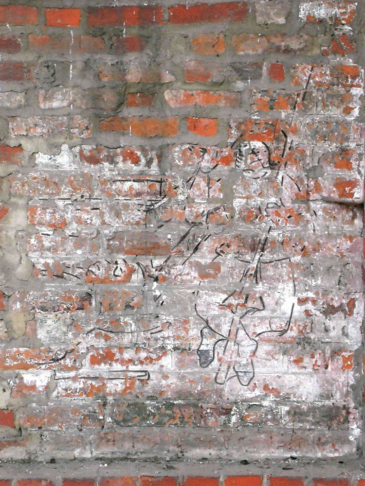 Ansicht auf die Südwand des mittleren Jochs mit der von Dipl.-Rest. Anja Romanowski 2004 erstellten Umzeichnung (schwarze Konturierung). Dargestellt sind fünf nicht mehr genau zu identifizierende Figuren