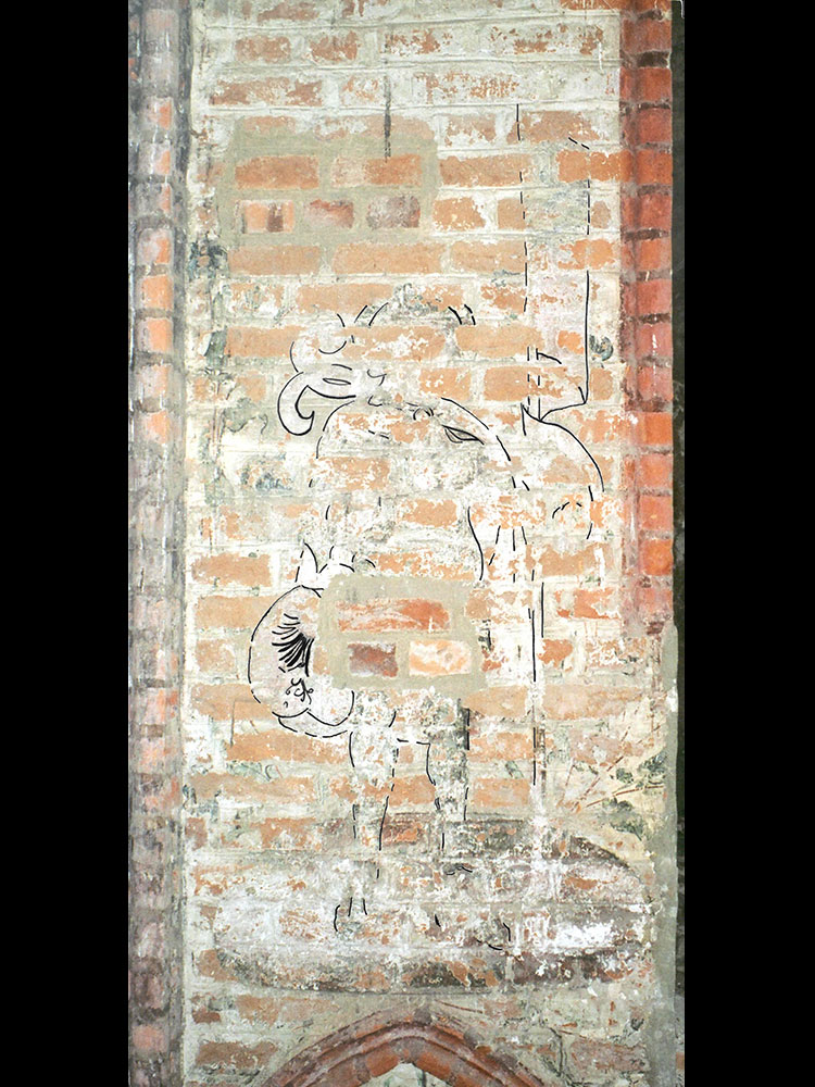 Nordwand, westliches Joch mit Nische, Rücklage, figürliche Darstellung auf roter Unterlegung mit schwarzer Vorzeichnung