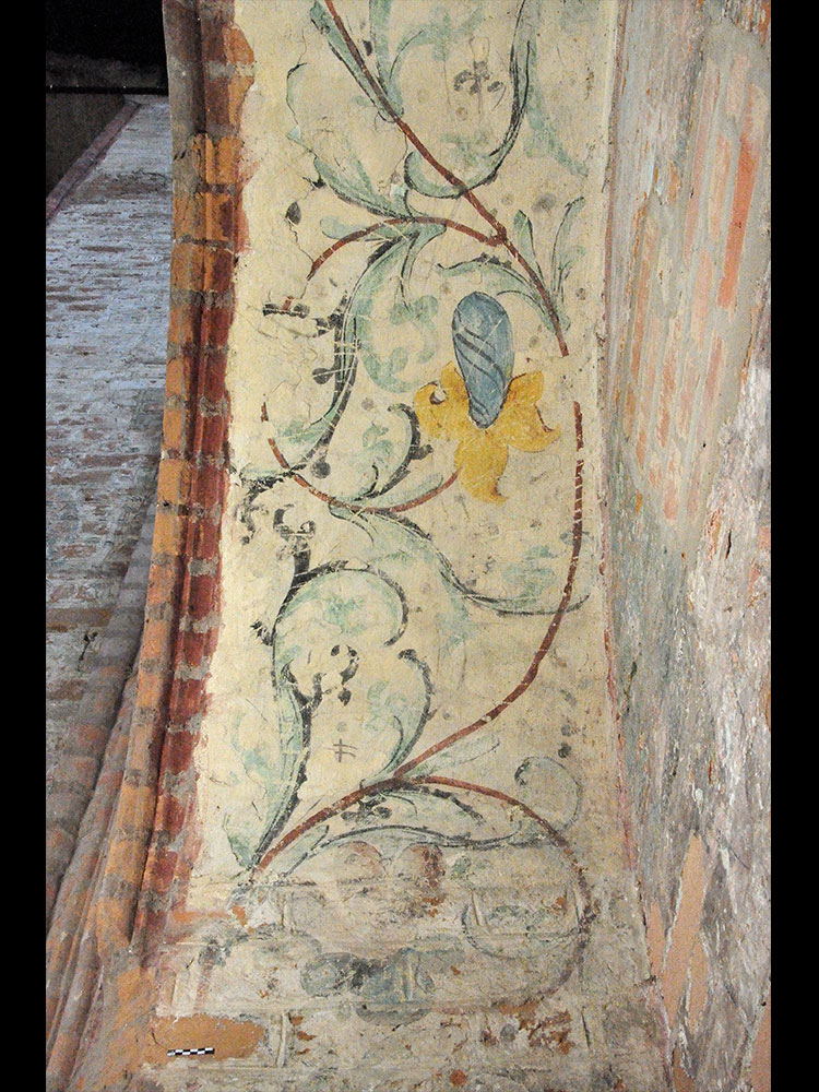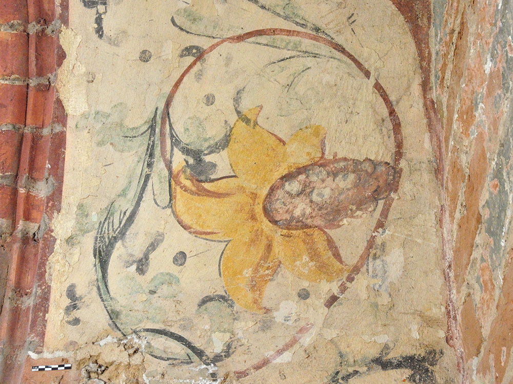 Zur zweiten Gestaltungsphase gehören die vegetabilen, teils floralen Rankenmalereien sowie figürliche, teilweise szenisch angelegte Darstellungen, die heute nur noch vereinzelt und schwer erkennbar sind (Abb. 07 bis 11). Im östlichen Bereich der Kapelle lassen sich hingegen keine ornamentalen oder figürlichen Bemalungen feststellen: