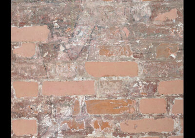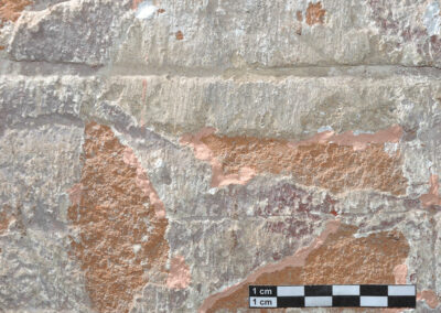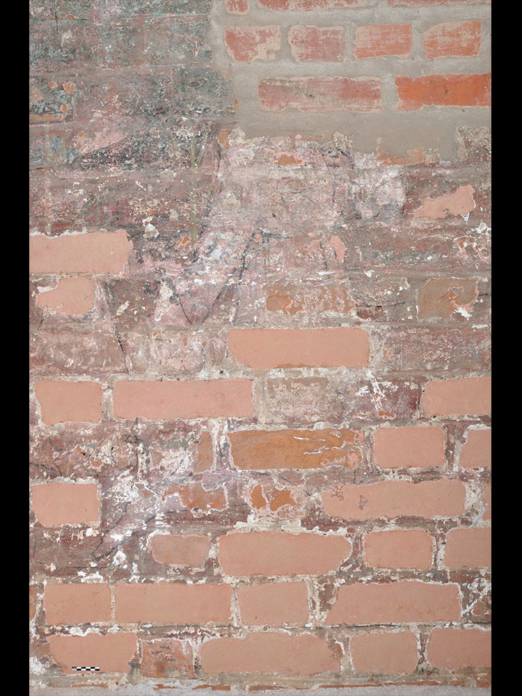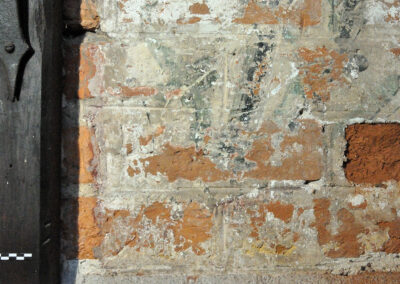 Zunächst erhielten die bauzeitlichen Architekturoberflächen eine Oberflächenstrukturierung mittels Fugenritzungen. Hiervon blieben alle Formsteinflächen ausgespart. Teilbereiche wie die Bogenlaibungen, aber auch die Wandflächen oberhalb der Türöffnungen und der nördlichen Nischen unterhalb der Empore wurden mit einem Kalkmörtel glatt verputzt. Während die Lisenen, Rippen, Nischen-, Fenster- und Türeinfassungen mit wenigen Ausnahmen in kühlem Rot gefasst wurden, erhielten die übrigen Wandflächen eine Beschichtung mit gelblich weißer Kalktünche (Abb. 13, 14). Die Kapitelle wurden polychrom gestaltet.²⁰