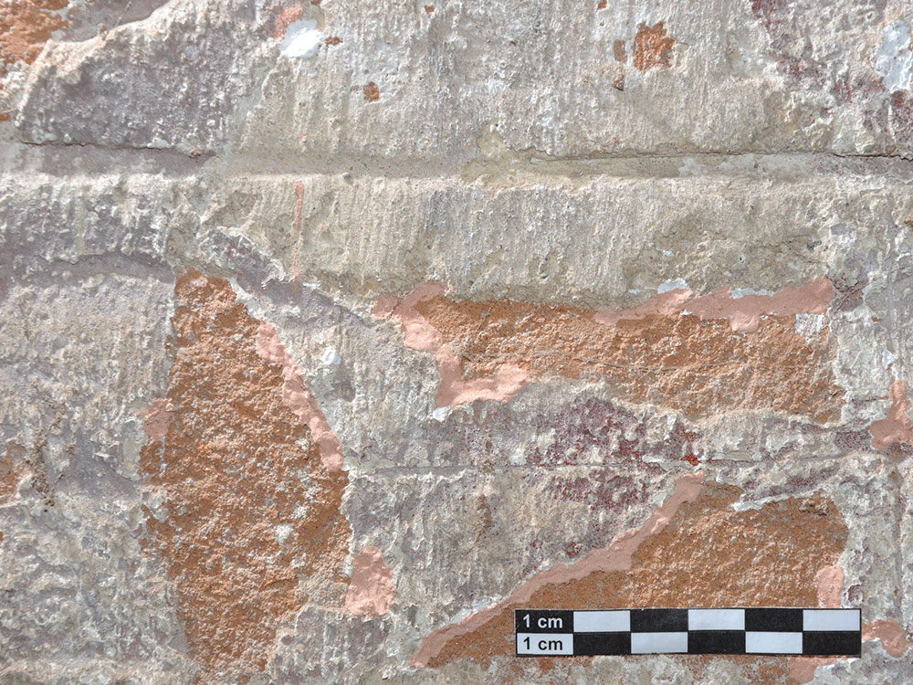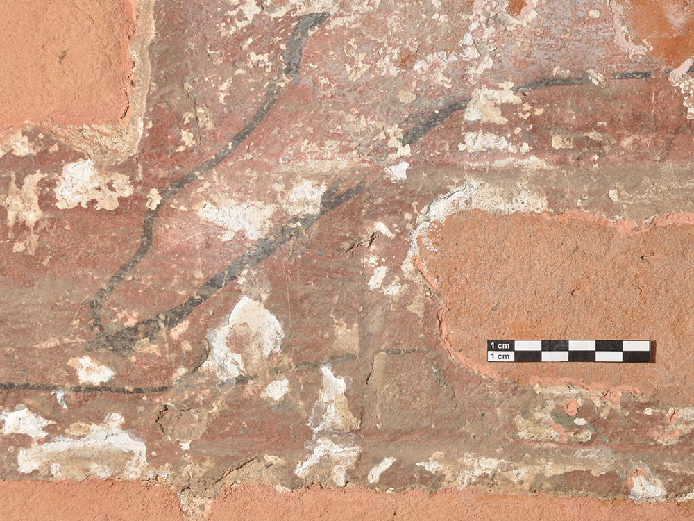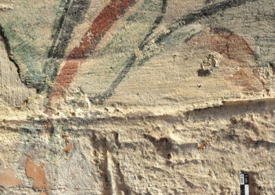 Romanowski attestiert den Malereien 2009 eine ehemals starke Lokalfarbigkeit, die auf der Verwendung sehr farbintensiver Pigmente wie Azurit, Malachit, Blei-Zinn-Gelb, Zinnober und Mennige basiere.²³ Darüber hinaus kamen gedecktere Farben durch die Verwendung roter und gelber Ocker, Pflanzenschwarz und Calciumcarbonat als Weißpigment zum Einsatz. Teilweise wurde die Farbwirkung durch Auftrag verschieden farbiger Schichten gesteuert. Plastizitäten wurden durch unterschiedliche grafische und malerische Methoden erzeugt (Abb. 10, 11, 16, 17). Das Bindemittel der Malerei konnte bislang analytisch nicht eindeutig nachgewiesen werden. Singulär steht der Nachweis eines gewissen Anteils an Protein. Eine Ausführung in Secco-Technik unter Verwendung organischer Bindemittel wie in der Temperamalerei liege laut Romanowski phänomenologisch jedoch nahe.²⁴